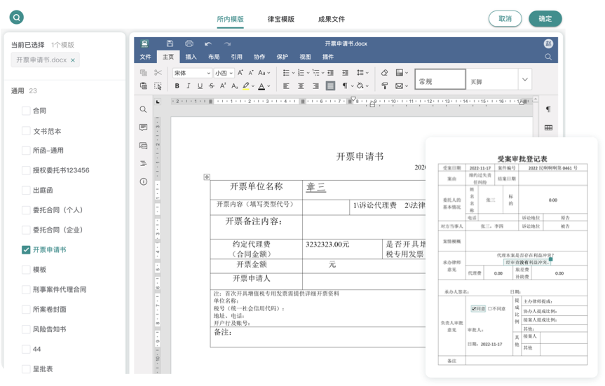 用章审批、电子章、日常行政、财务工作在线化、自动化,降低行政成本与工作强度,帮助律师更加专注业务;